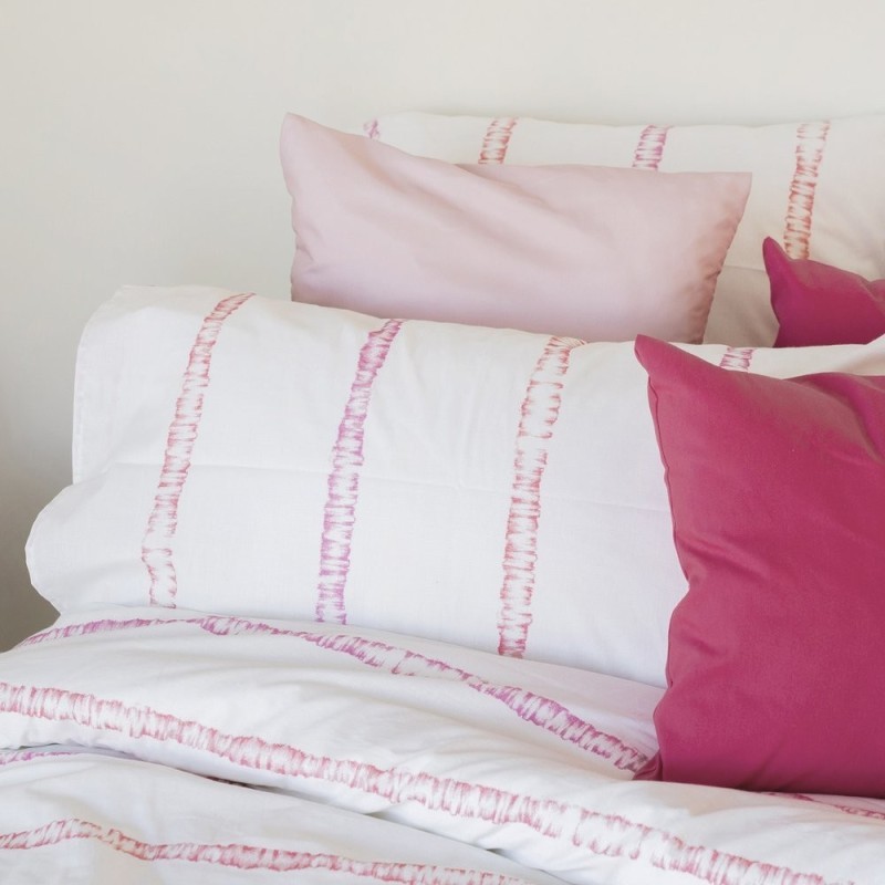 El estampado Aure Geraneo es un poema de color: finas rayas acuareladas en rosa y salmón sobre un fondo con textura de lino. Evoca jardines en flor y tardes doradas, aportando luz, frescura y optimismo al dormitorio. Perfecta para quienes buscan un ambiente sereno pero lleno de vida.