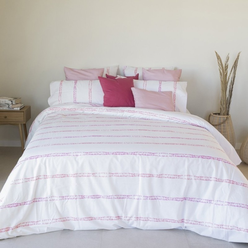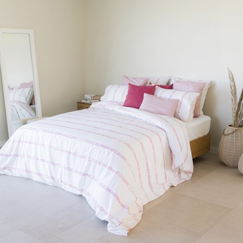 El estampado Aure Geraneo es un poema de color: finas rayas acuareladas en rosa y salmón sobre un fondo con textura de lino. Evoca jardines en flor y tardes doradas, aportando luz, frescura y optimismo al dormitorio. Perfecta para quienes buscan un ambiente sereno pero lleno de vida.