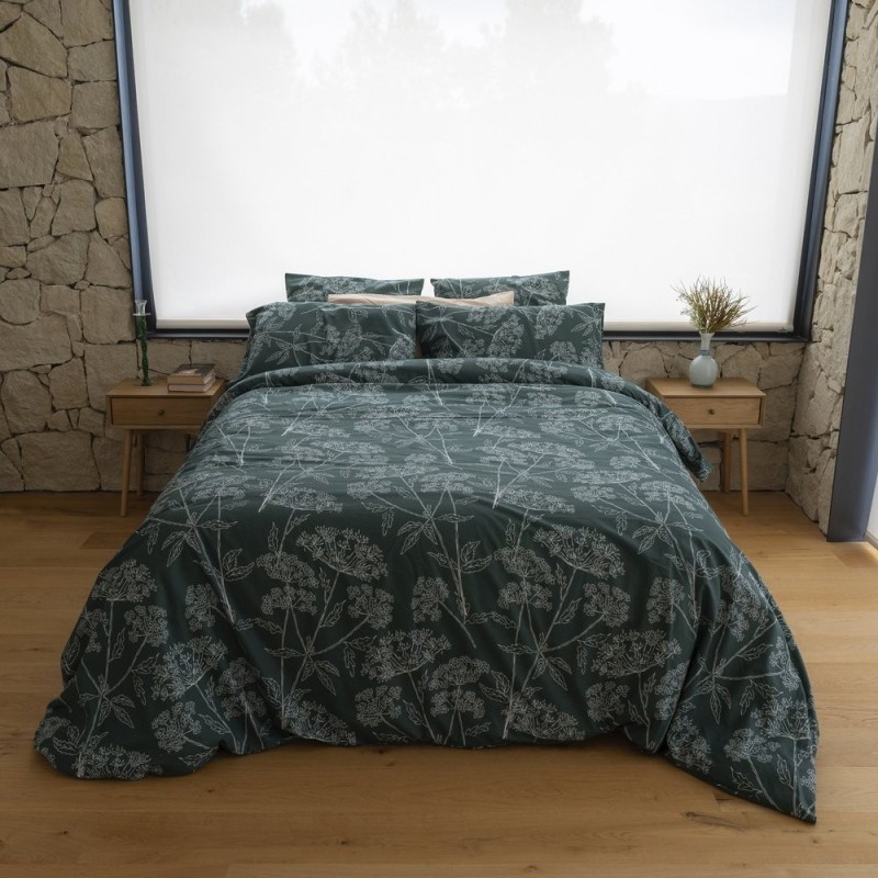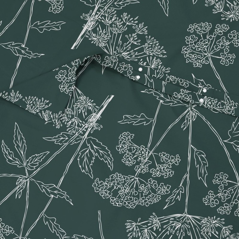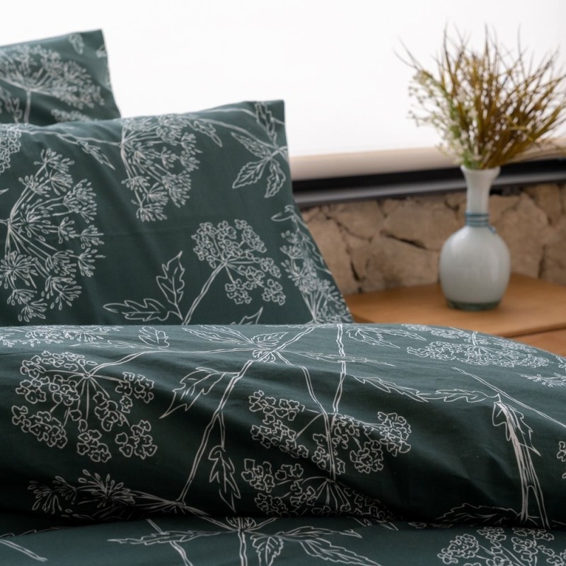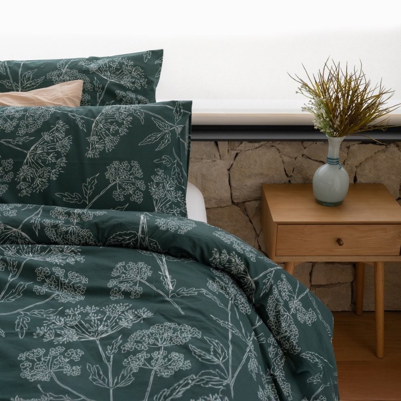 El estampado Brezza Oliva evoca la calma de los atardeceres rurales con un dibujo botánico lineal en blanco sobre un fondo verde profundo. Los trazos delicados de hojas y flores crean un ritmo elegante y orgánico que transmite serenidad, sofisticación y un punto de misterio. Aporta carácter sin perder la suavidad romántica, convirtiendo la cama en un refugio íntimo donde soñar y descansar.