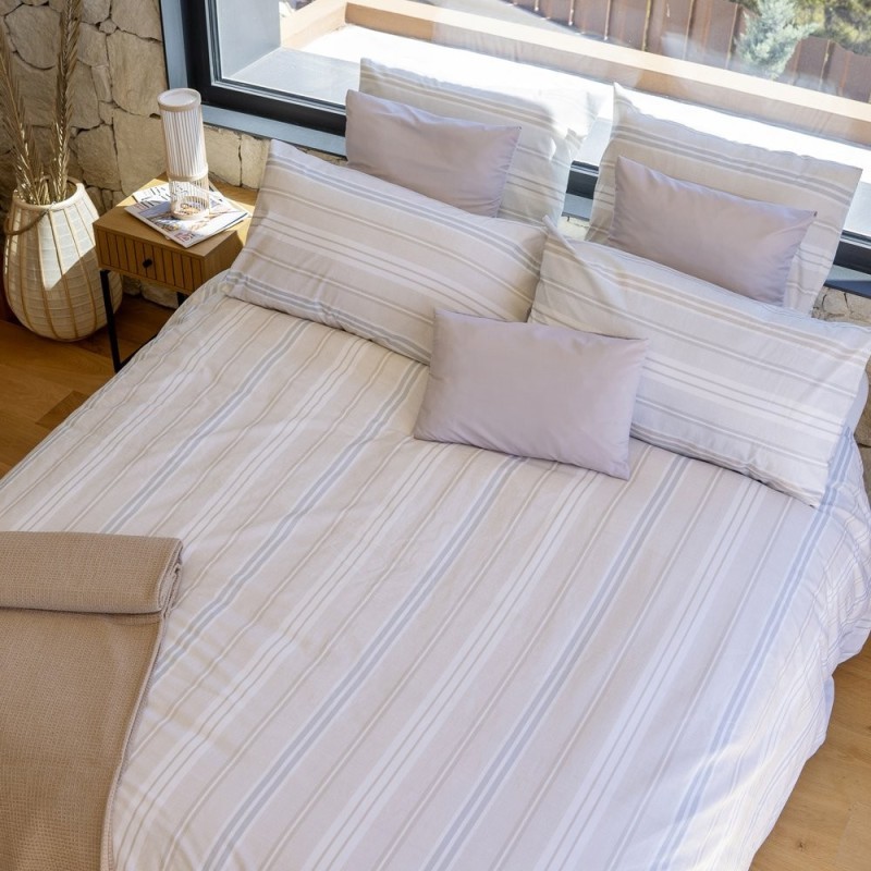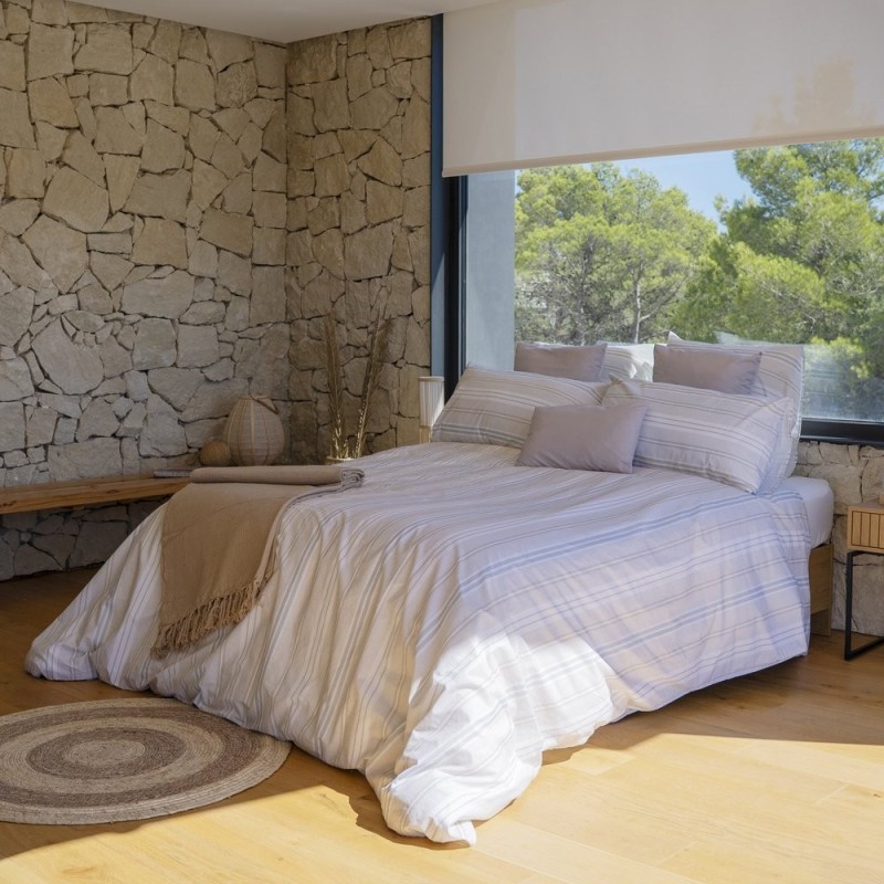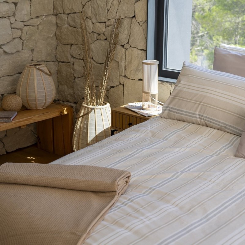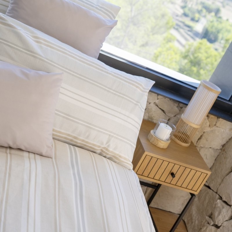El estampado cleo arena respira calma rural: franjas verticales en tonos crema, topo y gris suave sobre un fondo de lino lavado que evoca campos iluminados. Su paleta serena y textura natural transmiten romanticismo campestre y confort. Diseñada para crear un dormitorio acogedor y elegante, invita a soñar y descansar entre atmósferas cálidas y sencillas.