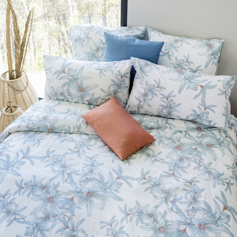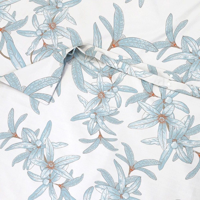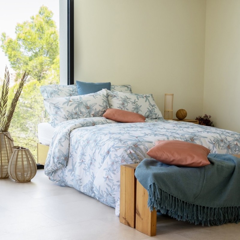 El estampado Diva Cielo despliega un jardín etéreo: motivos florales estilizados en azul hielo con toques cálidos en el centro sobre un fondo blanco, trazos delicados y textura sutil. Sus colores alegres y suaves evocan tardes doradas y brisas primaverales, llenando el dormitorio de serenidad y luminosidad. Es un refugio poético donde la naturaleza y la calma se abrazan, perfecto para despertar cada mañana con optimismo.