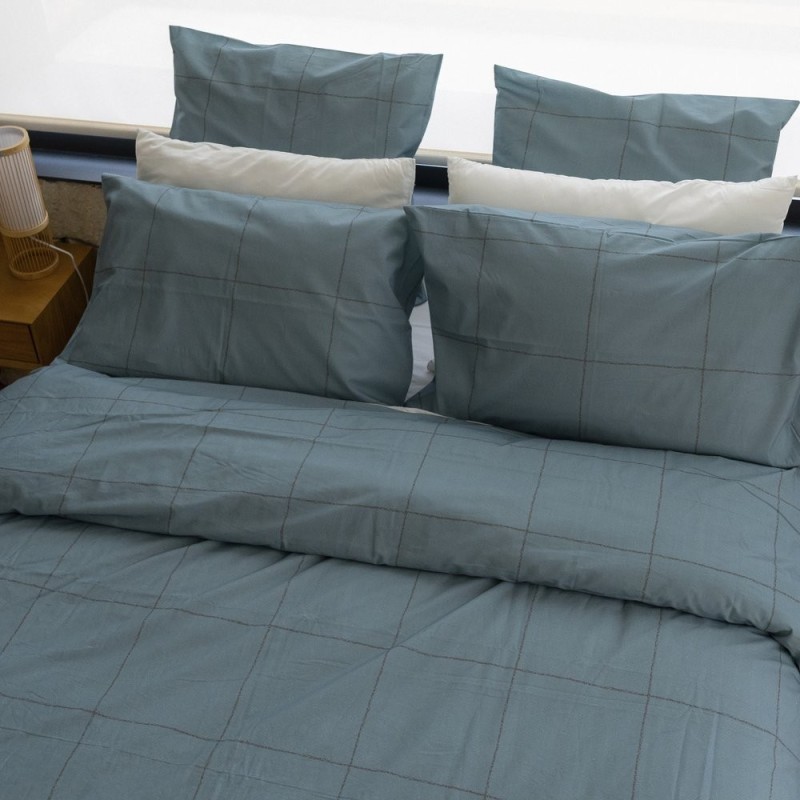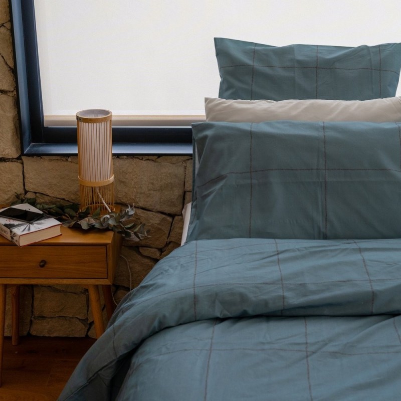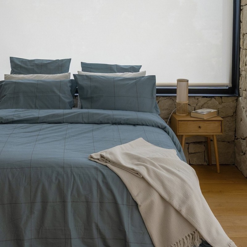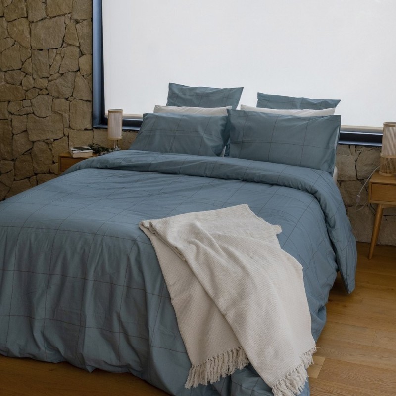 El estampado Filo Azulón combina magnetismo y sobriedad con una cuadrícula dibujada a mano en tonos azul grisáceo, donde la intensidad del color aporta presencia sin estridencia. Las líneas ligeramente texturizadas crean ritmo y profundidad, aportando carácter contemporáneo y elegante. Pensada para quienes buscan un punto focal con personalidad, equilibra dramatismo y serenidad, transformando la cama en un escenario sofisticado y acogedor donde descansar y soñar con estilo.