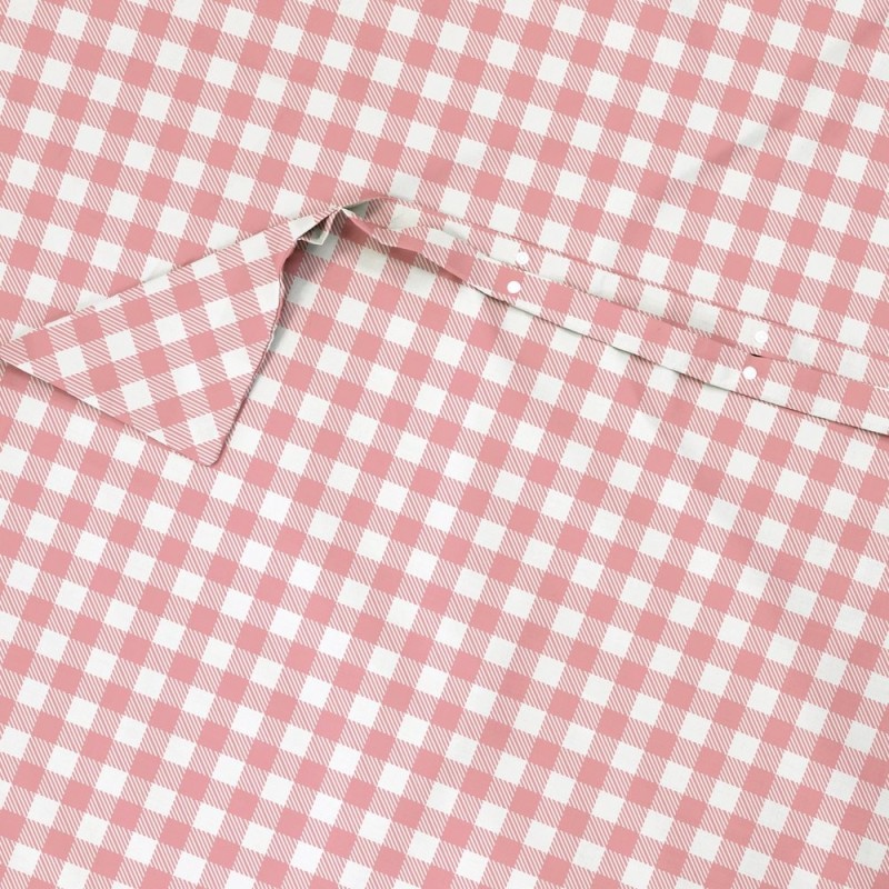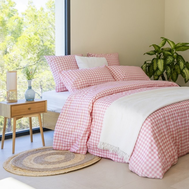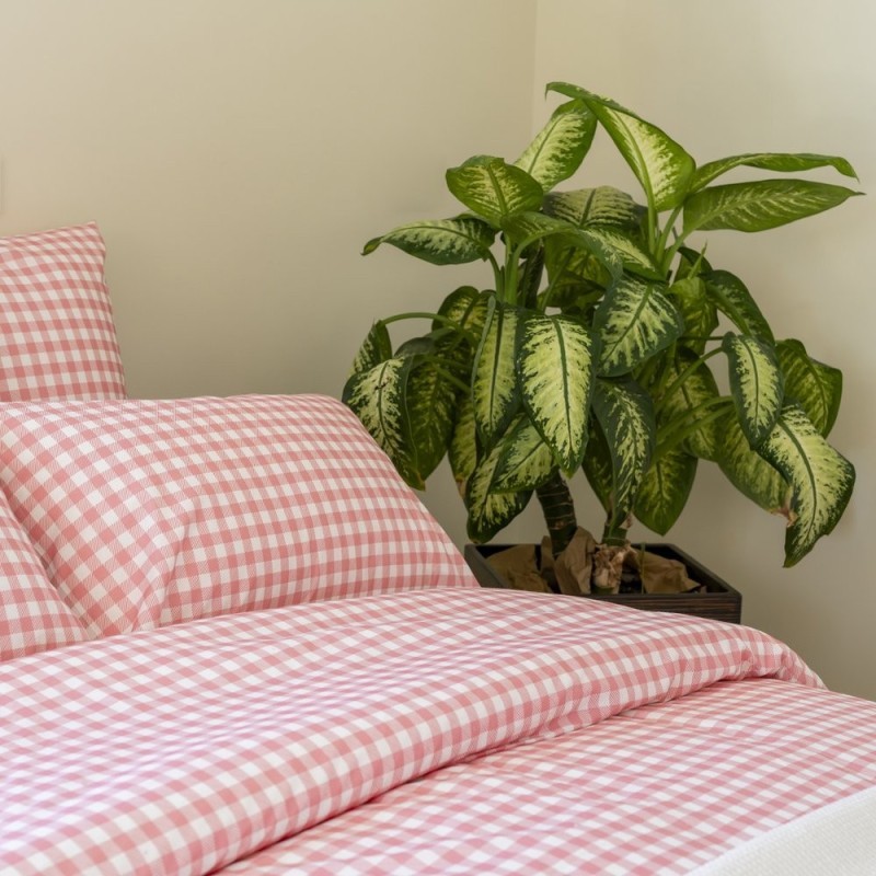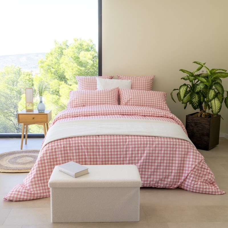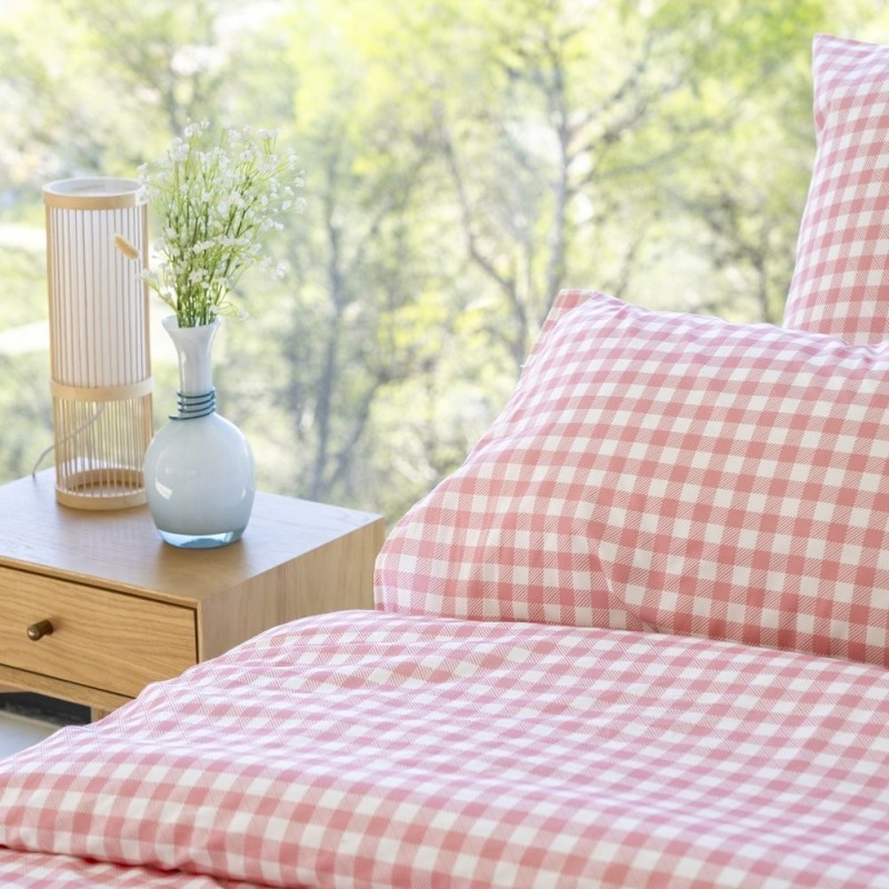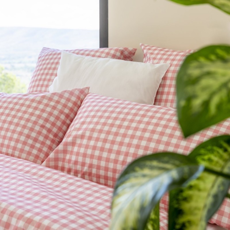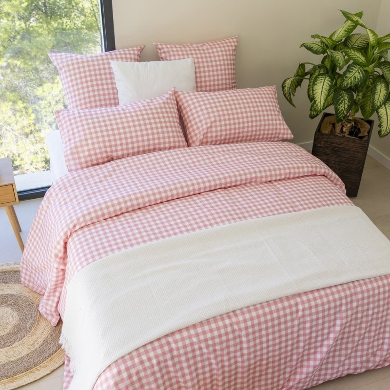 Estampado vichy en rosa empolvado y blanco, con cuadros clásicos y tramado diagonal sutil; estética acogedora, femenina y atemporal que aporta calidez y encanto al dormitorio.
