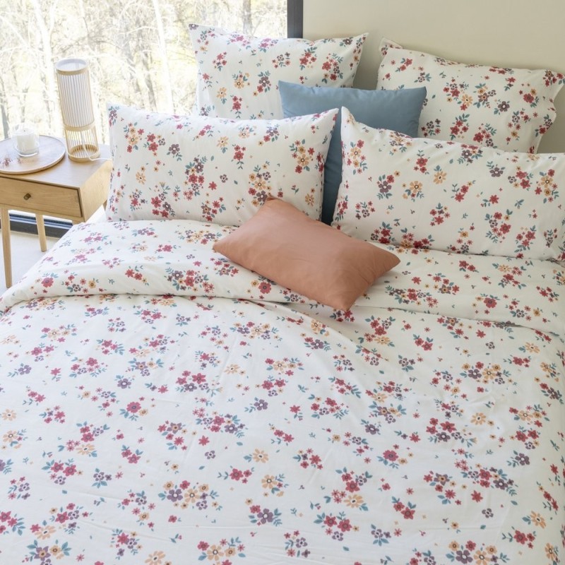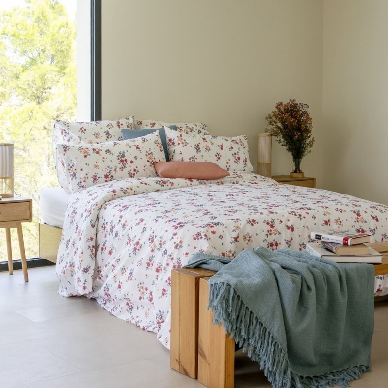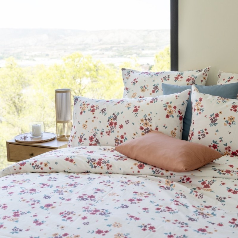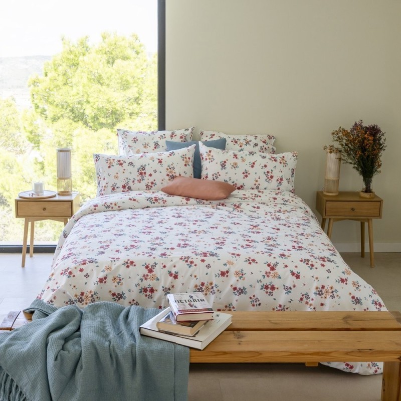 Estampado Vita Cereza con pequeños ramilletes florales en fucsia, coral y malva, hojas verde azulado; estilo alegre, delicado y fresco que llena el dormitorio de vitalidad y ternura.
