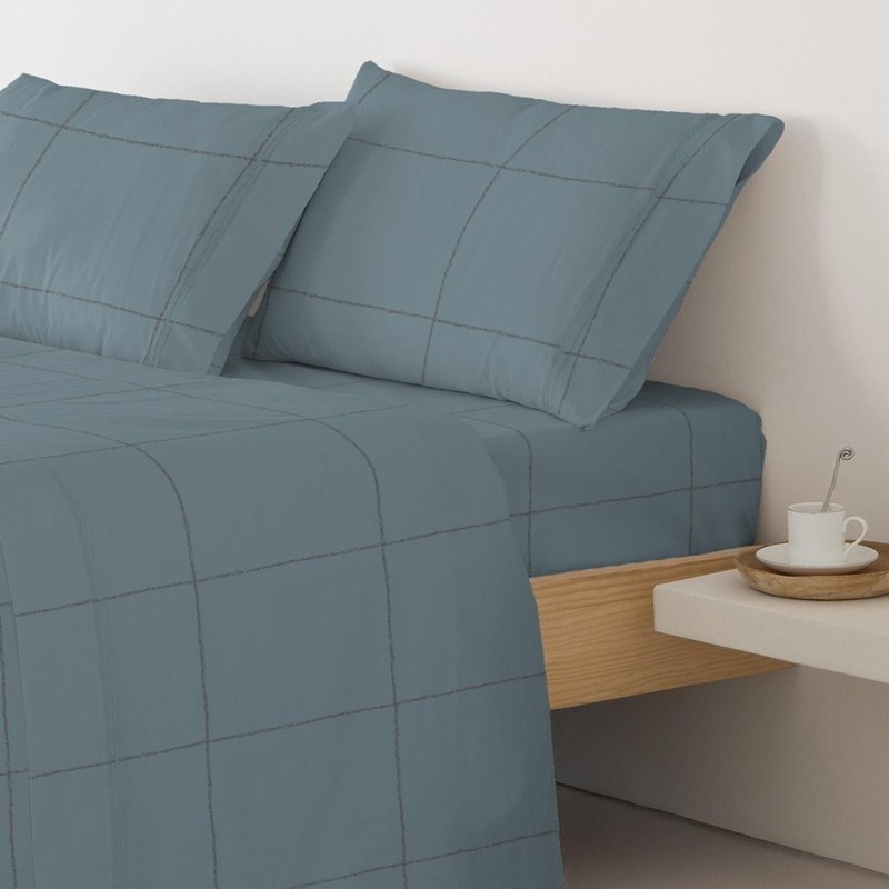 Juego de sábanas en tejido tafetán de algodón combinado de 144 hilos, suave y resistente para el uso diario. Se compone de sábana encimera, bajera ajustable y funda de almohada.