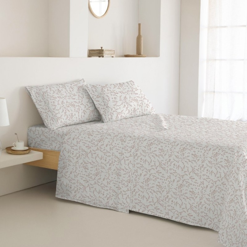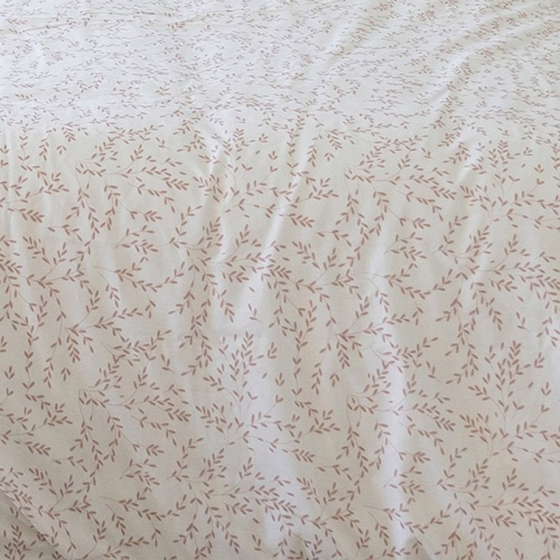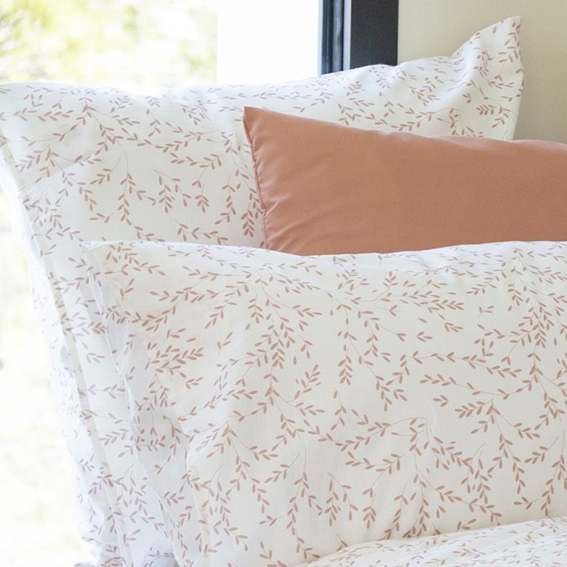 Este estampado con fondo blanco con delicados ramilletes de hojas en rosa empolvado, trazo fino y aire acuarelado; estética ligera, serena y femenina que aporta frescura y armonía al dormitorio.