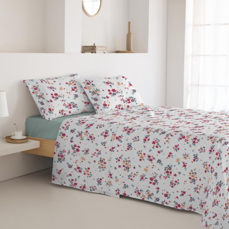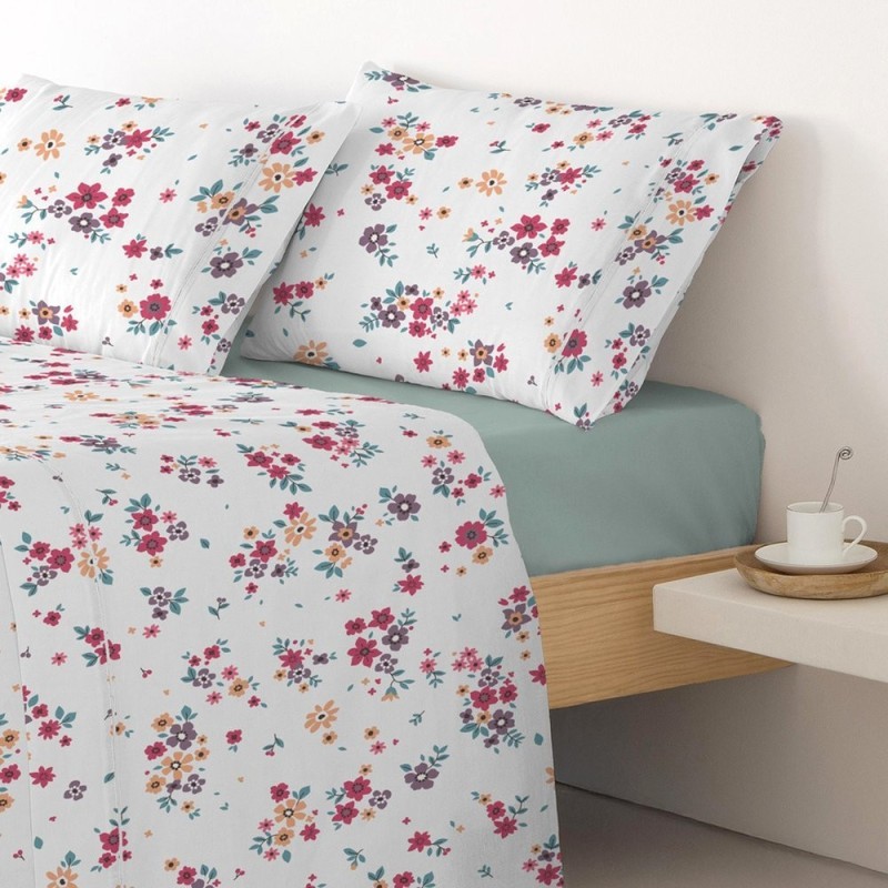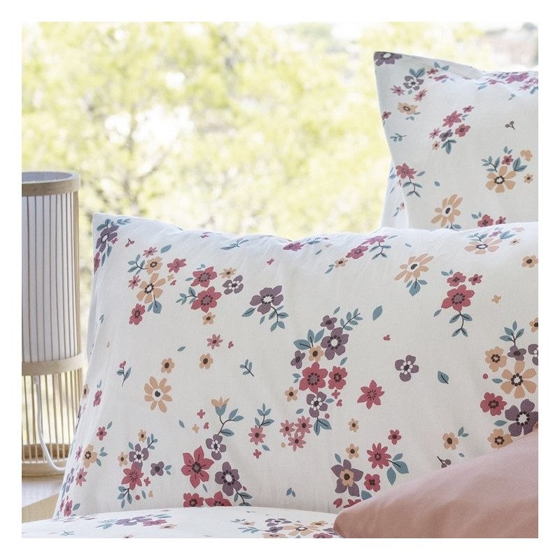 Estampado Vita Cereza con pequeños ramilletes florales en fucsia, coral y malva, hojas verde azulado; estilo alegre, delicado y fresco que llena el dormitorio de vitalidad y ternura.
