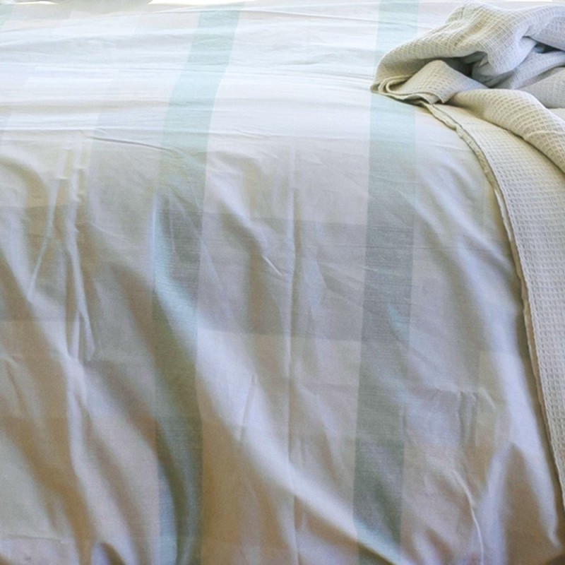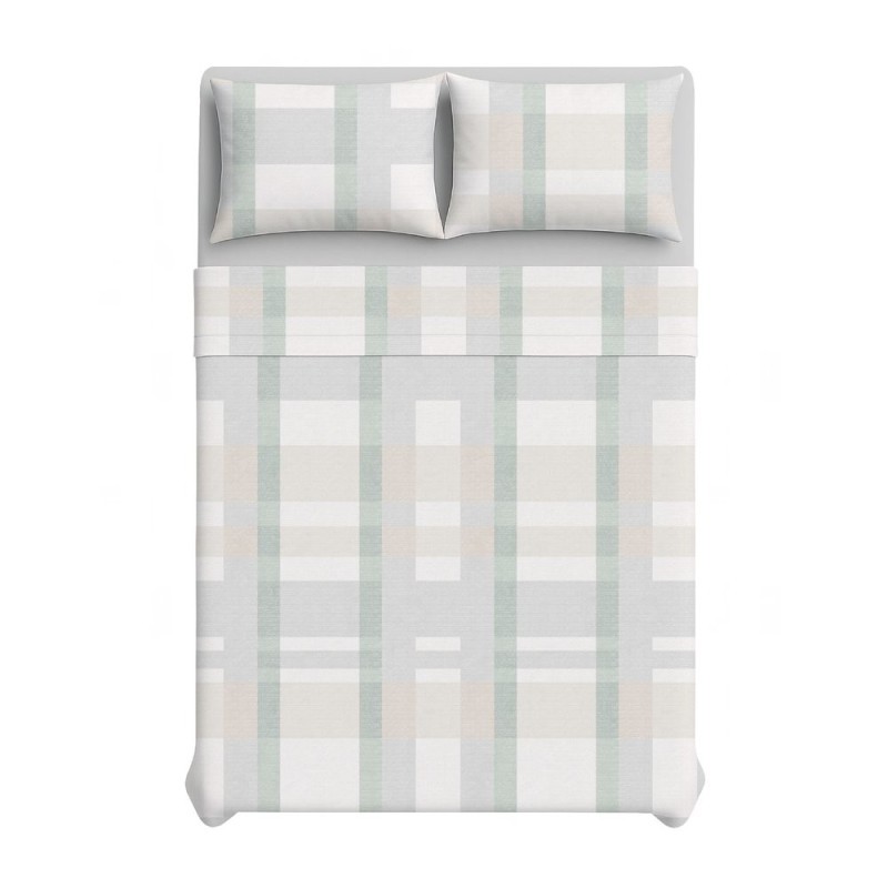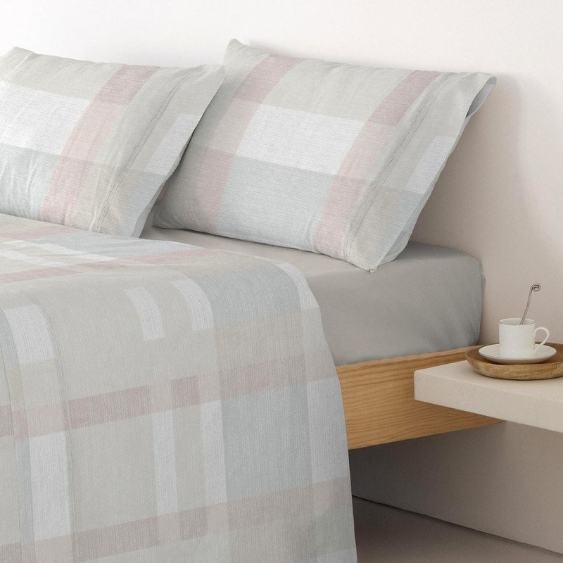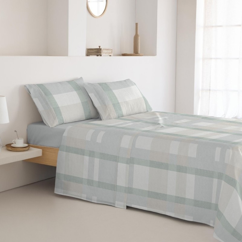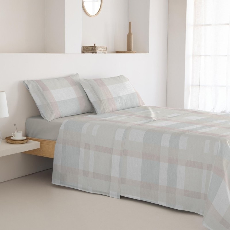 Juego de sábanas en tejido tafetán de algodón combinado de 144 hilos, suave y resistente para el uso diario. Se compone de sábana encimera, bajera ajustable y funda de almohada.